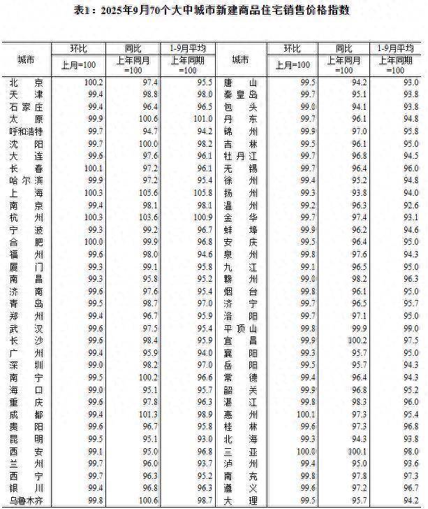 2025年9月份,70个大中城市中,各线城市商品住宅销售价格环比下降,同比降幅继续呈收窄态势。